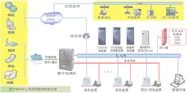 大、中型电信级呼叫中心典型应用(iCall3000系列)。系统网络架构拓扑图如下图所示: